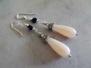 Enchanted Earrings- Vintage Opalized Pastel Pink Glass with Black Onyx and Sterling Silver Accents