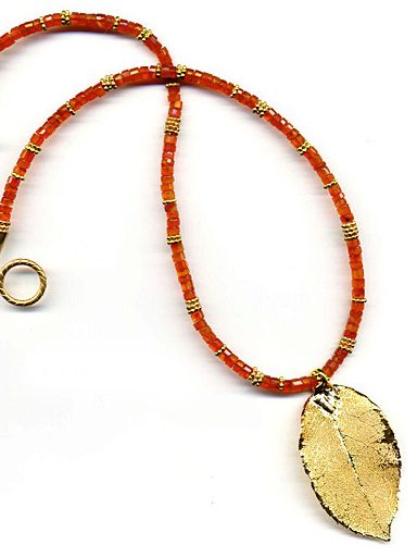 Faceted carnelian gemstone beads with a genuine gold plated leaf