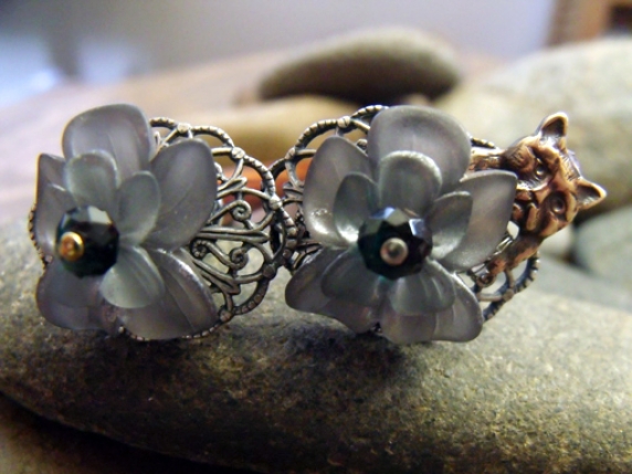 Dusty teal posies, crystal and brass kitty hairsticks.