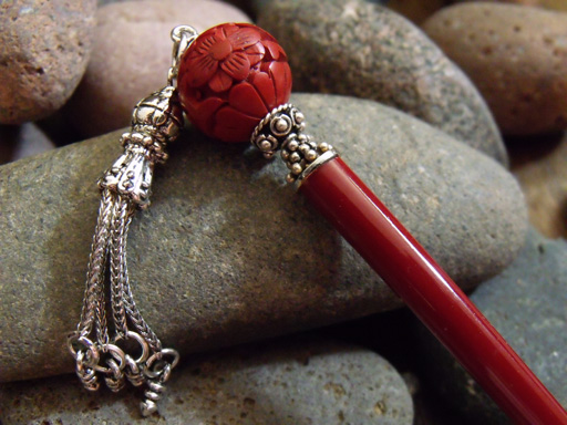 A floral carved red lacquer “cinnabar” bead is adorned with sterling silver accents. Dangling from the top is a silverplated tassel full of intricate detailing and a quartet of flirty dancing chains.