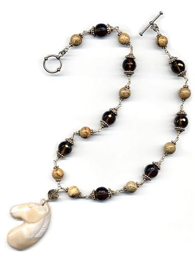 Picture jasper and smoky quartz on a hand linked sterling silver chain with hand carved mother-of-pearl horse