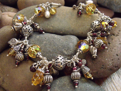 We start with a handcrafted bracelet of vintage Swarovski® topaz crystals and ornate pierced sterling silver beads. Clusters of garnet gemstone orbs, vintage topaz crystals and glass are attached with sterling silver wire at intervals on the bracelet.