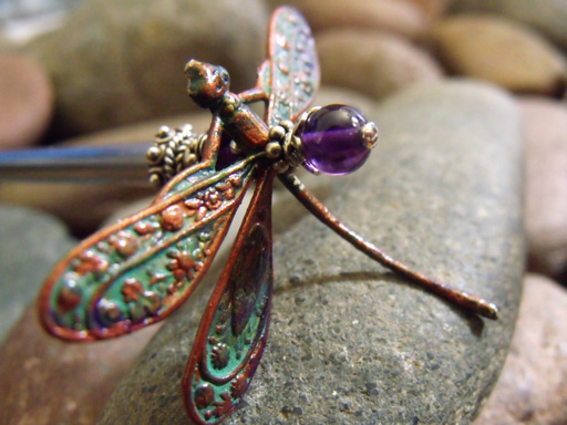 Ornate hand-tinted brass dragonfly adorned with an amethyst gemstone orb.