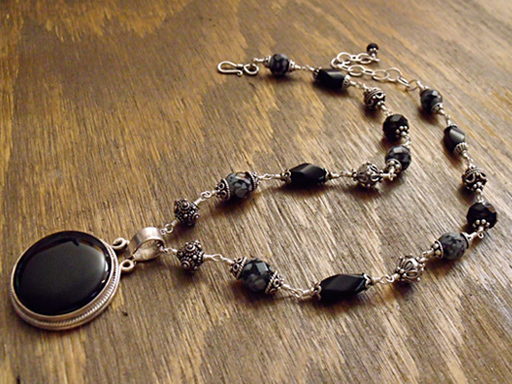Hand crafted links of sterling silver and onyx with pendant of sterling silver and obsidian