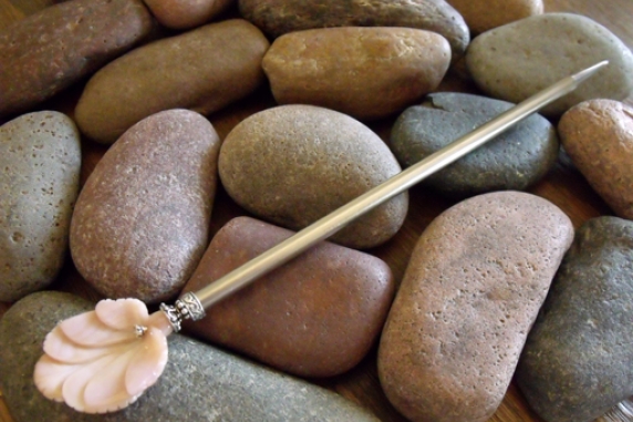 Fairy’s Fan - Natural Pink Shell Carved Fan Hairstick with Sterling Silver Accents and Stainless Steel