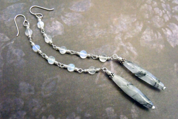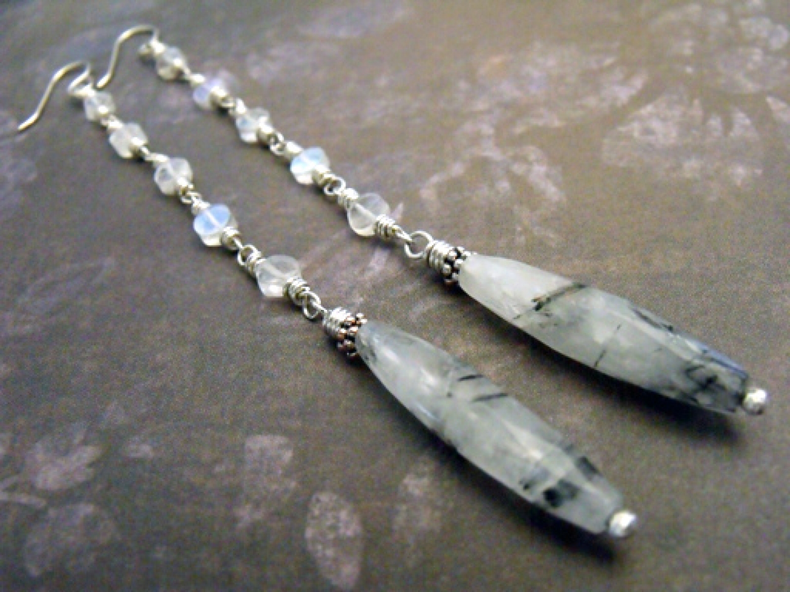 Moonlit Magic Dangle Earrings - Moonstones and Natural Tourmalinated Quartz with Sterling Silver